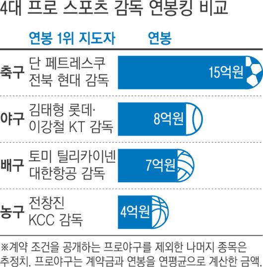 또 다른 프로 종목인 배구와 농구는 그보다도 낮다. 2년 연속 프로배구 V리그 남자부 감독상을 받은 토미 틸리카이넨 대한항공 감독(36)이 7억원 안팎을 수령하는 최고 연봉자다. 농구에선 슈퍼팀 부산 KCC 전창진 감독(60)이 4억원으로 가장 많이 받고 있다.