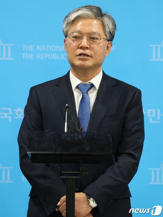(서울=뉴스1) 황기선 기자 = 전남 해남·완도·진도 지역구에 출마 준비 중인 정의찬 더불어민주당 대표 특보가 15일 오후 서울 여의도 국회 소통관에서 당 공직후보자검증위원회 재심 결정에 대한 입장을 발표하고 있다. 더불어민주당은 이날 과거 고문치사 사건에 연루돼 유죄 판결을 받은 정 특보에 대해 기존 공천 적격 판정을 '부적격'으로 뒤집었다. 2023.12.15/뉴스1