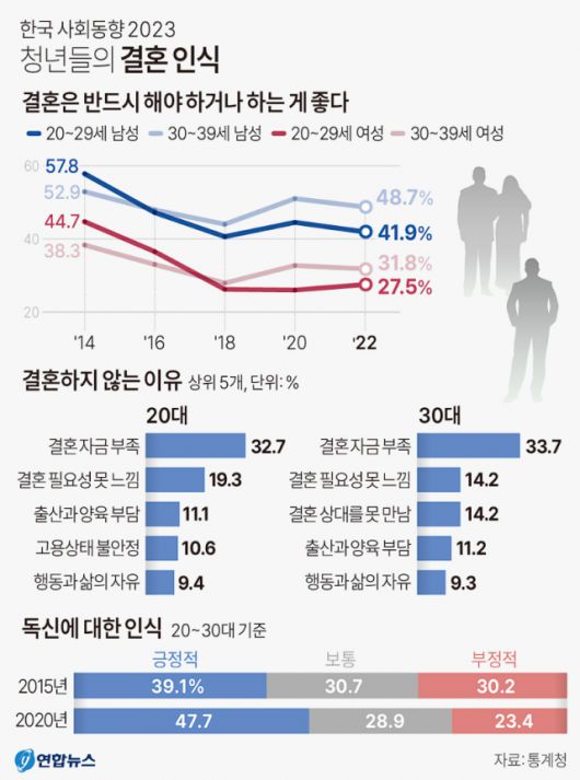 한편 통계청이 15일 발표한 ‘한국의 사회동향 2023’을 보면 결혼을 긍정적으로 생각하는 20대 여성은 지난해 27.5%에 불과했다. 절반 이상이 결혼을 원했던 2008년(52.9%)과 비교하면 25.4%포인트 감소한 수치다. 같은 기간 결혼에 긍정적인 20대 남성의 비중도 71.9%에서 41.9%로 떨어졌다. 남성보다 여성이, 30대보다 20대에서 결혼에 대한 긍정적 태도가 더 낮았다.