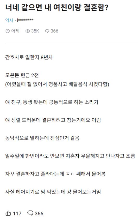 자신의 직업을 약사로 등록한 남성 A씨는 여자친구가 간호사로 근무한 지 8년 차라고 소개했다. 그는 "여자친구가 어렸을 때 철없어서 명품 사고 배달 음식 시켰다고 한다"라며 "모은 돈이 현금 2000만원"이라고 밝혔다.