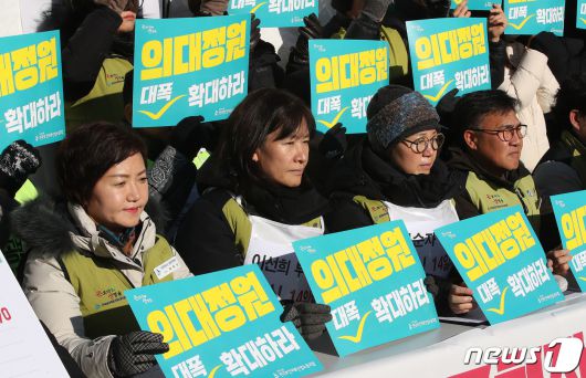 (서울=뉴스1) 임세영 기자 = 민주노총 전국보건의료산업노동조합 관계자들이 17일 오전 서울 여의도 국회 앞에서 의사 집단 진료거부 관련 국민여론조사 및 의사인력 실태조사 결과 발표 기자회견을 갖고 있다. 2023.12.17./뉴스1