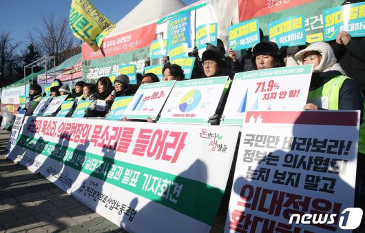 (서울=뉴스1) 임세영 기자 = 민주노총 전국보건의료산업노동조합 관계자들이 17일 오전 서울 여의도 국회 앞에서 의사 집단 진료거부 관련 국민여론조사 및 의사인력 실태조사 결과 발표 기자회견을 갖고 있다. 2023.12.17./뉴스1