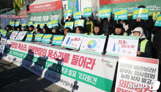(서울=뉴스1) 임세영 기자 = 민주노총 전국보건의료산업노동조합 관계자들이 17일 오전 서울 여의도 국회 앞에서 의사 집단 진료거부 관련 국민여론조사 및 의사인력 실태조사 결과 발표 기자회견을 갖고 있다. 2023.12.17./뉴스1