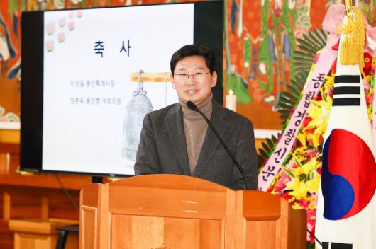이상일 시장이 16일 오후 처인구 역북동 용인 호국선봉사 대웅전에서 열린 ‘2023년 용인시 불교연합회 송년 법회’에 참석해 축사를 하고 있다. 용인시 제공 |