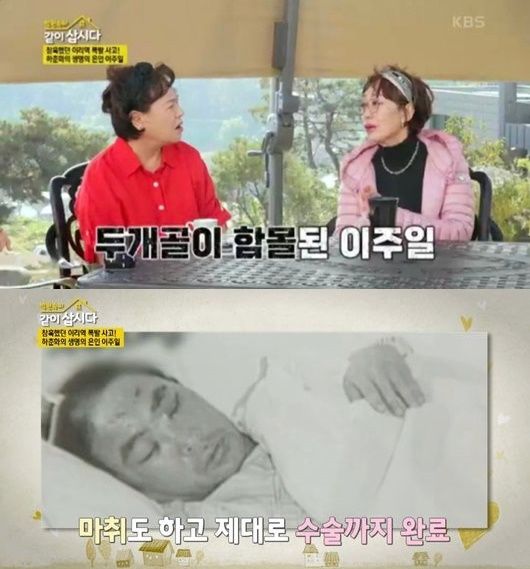 하춘화는 “이주일은 긴급 수술 대상이었다. 환경이 열악해서 마취 없이 뇌수술을 진행했는데, 수술 후 이주일이 막 울더라. 정말 비참해서 못 보겠더라. 나는 어깨뼈 골절로 상반신 깁스를 하고 서울 병원으로 갔다”라고 말했다.