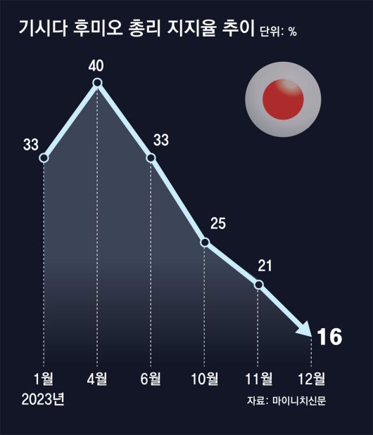 17일 마이니치신문 여론조사 결과 기시다 총리의 지지율은 16%로 2021년 10월 취임 이후 최저치였다. 기시다 정권에 반대한다는 응답은 79%에 달했다. 마이니치신문이 여론조사에 현 정권 지지 여부를 묻는 질문을 포함시킨 1947년 이후 ‘지지하지 않는다’고 답한 비율이 가장 높게 나타났다.