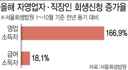 개인회생 신청자 중 급여소득자는 1만4591건(71%), 영업소득과 급여소득이 모두 있는 자는 1132건(6%)으로 나타났다. 특히 자영업자 개인회생 신청이 1년 새 2.7배로 급증할 때 급여소득자 개인회생 신청은 20% 증가에 그쳤다. 이에 따라 전체 개인회생 신청 건수에서 자영업자가 차지하는 비중도 올해 10월까지 23%로 1년 전(12%)보다 약 2배 가까이 커졌다.