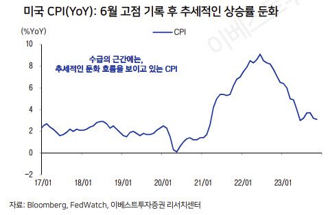 그 근간에는 과도한 기대함이 자리하고 있다는 것이다. 정 연구원은 “여전히 견조한 고용과 소매 판매 하에 2023년 6월 이후 소비자물가지수(CPI)는 둔화 흐름을 보이고 있다”며 “2024년엔는 150bp(1bp=0.01%포인트)에 달하는 기준금리 인하 기대감이 상존한다”고 했다.