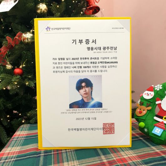 소아암 전문 비영리단체 한국백혈병어린이재단은 지난 15일 가수 임영웅 팬클럽 ‘영웅시대 광주전남’으로부터 500만 원을 기부받았다고 밝혔다. 이번 기부금은 영웅시대 광주전남 소속 134명의 팬이 임영웅 전국 콘서트 '아임 히어로' 투어를 기념해 마련했다. 기부금은 소아암 및 희귀난치 질환을 진단받고 치료 중인 소아암 어린이의 치료비 및 니버 캠페인에 사용될 예정이다.