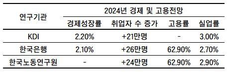 KDI는 내년 내수 증가세가 둔화되며 취업자 수 증가 폭이 올해(30만명대 초중반)보다 줄어든 21만명으로 전망했다. 실업률도 올해(2%대 중후반)보다 높은 3% 내외를 기록할 것으로 내다봤다. 다만 생산인구 감소를 감안하면 내년 취업자 수 증가폭은 여전히 높은 수준이고, 실업률도 예년에 비해 여전히 낮은 수준이라고 지적했다.