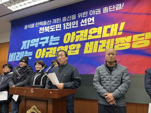 (전주=연합뉴스) 정경재 기자 = 전북지역 진보성향 시민·사회단체는 18일 전북도의회에서 도민 1천인 선언 기자회견을 열고 "진보 진영의 압도적 승리를 위해 야권연대를 이뤄내야 한다"고 주장했다.