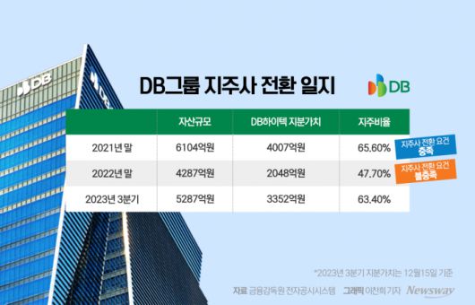 DB그룹이 지주회사 전환 늪에 빠졌다. 올해 공정거래위원회의 '타깃'에서 벗어났으나 자산가치가 높아지면서 1년 만에 다시 부담을 짊어지게 된 것이다. 공정거래법상 자회사 지분을 30% 이상 확보해야 해 '재무리스크'가 불가피할 전망이다.