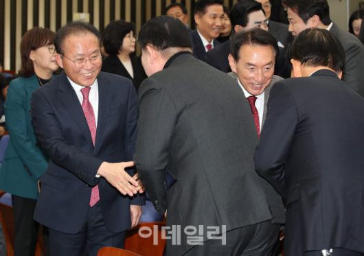 [이데일리 노진환 기자] 윤재옥 국민의힘 당대표 권한대행과 김석기 최고위원이 18일 오후 서울 여의도 국회에서 열린 국민의힘 국회의원 및 당협위원장 연석회의에서 참석자들과 인사하고 있다.
