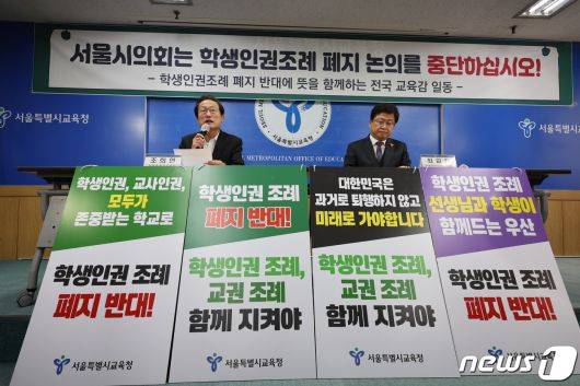 (서울=뉴스1) 박정호 기자 = 조희연 서울시교육감과 최교진 세종시 교육감이 19일 오전 서울 종로구 송월길 서울특별시교육청에서 서울학생인권조례 폐지 반대에 뜻을 함께하는 교육감 일동 입장문 발표 기자회견을 하고 있다. 교육감들은 “학생인권조례 폐지는 학생 인권의 후퇴이자 민주주의의 퇴보로 서울시의회는 시대착오적이며 차별적인 조례폐지를 중단하길 바란다”고 밝혔다. 한편 이날 입장문에는 조희연 서울시교육감과 도성훈 인천시교육감, 이정선 광주교육감, 천창수 울산교육감, 최교진 세종교육감, 김지철 충남교육감, 박종훈 경남교육감, 김광수 제주교육감이 이름을 올렸다. 2023.12.19/뉴스1