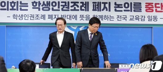 (서울=뉴스1) 박정호 기자 = 조희연 서울시교육감과 최교진 세종시 교육감이 19일 오전 서울 종로구 송월길 서울특별시교육청에서 서울학생인권조례 폐지 반대에 뜻을 함께하는 교육감 일동 입장문 발표 기자회견에 참석하고 있다. 교육감들은 “존중과 사랑을 받고 자란 아이들이 다른 사람도 존중하고 사랑할 줄 아는 사람으로 성장한다”며 “학생인권조례 폐지는 학생 인권의 후퇴이자 민주주의의 퇴보로 서울시의회는 시대착오적이며 차별적인 조례폐지를 중단하길 바란다”고 밝혔다. 한편 이날 입장문에는 조희연 서울시교육감과 도성훈 인천시교육감, 이정선 광주교육감, 천창수 울산교육감, 최교진 세종교육감, 김지철 충남교육감, 박종훈 경남교육감, 김광수 제주교육감이 이름을 올렸다. 2023.12.19/뉴스1