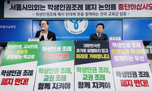 교육감들은 이와 관련해 “서울시의회는 조례가 학생들에게 동성애를 권장하고 성문란을 조장하며 학생의 권리만 보장해 교권 붕괴를 초래하고 있다는 폐지론자들의 주장에 동조하고 있다”고 비판했다.