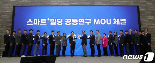 (성남=뉴스1) 박세연 기자 = 원희룡 국토교통부 장관이 19일 오후 경기도 성남시 네이버 본사에서 열린 스마트 빌딩 활성화 로드맵 발표식에서 채선주 네이버 ESG 대표를 비롯한 참석자들과 스마트 빌딩 공동연구 MOU 세리머니를 하고 있다. 2023.12.19./뉴스1
