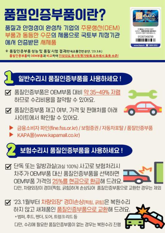 금융감독원은 20일 품질인증부품 관련 소비자 대상 홍보를 강화하겠다고 밝혔다. 또 보험사 및 정비업체가 품질인증부품 관련 제도를 숙지하고 소비자에게 안내할 수 있도록 교육자료를 제작해 체계적인 교육을 실시할 예정이다.