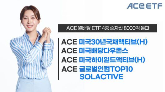 한국거래소에 따르면 ACE 월배당 ETF 4종의 합산 순자산액은 지난 15일 8068억원으로 8000억원을 처음 돌파했다. 현시점 4종 순자산액은 8136억원이다. 각 상품별 순자산액은 △ACE 미국30년국채액티브(H) ETF 6035억원 △ACE 미국배당다우존스 ETF 1929억원 △ACE 미국하이일드액티브(H) ETF 91억원 △ACE 글로벌인컴TOP10 Solactive ETF 81억원이다.