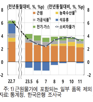소비자물가 상승률(전년동월대비)은 지난해 7월 6.5%로 정점을 찍은 이후 1년간 큰 폭으로 둔화해 올해 7월 중 2.4%까지 낮아졌다. 그러나 8월부터 다시 반등해 10월 중 3.8%로 높아졌다가, 11월에는 반년 전과 비슷한 수준(3.3%)으로 상당폭 낮아졌다.