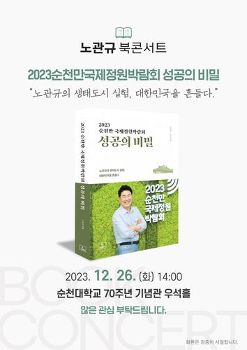 20일 지역 정가에 따르면 노 시장은 오는 26일 오후 2시 순천대학교에서 저서 '2023 순천만국제정원박람회 성공의 비밀'을 소개하는 북콘서트를 개최한다.