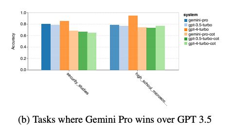 하지만 이번에 연구진이 실시한 '지식 기반 질의응답' 테스트의 일환으로 STEM, 인문학, 사회 과학 전반에 걸쳐 57개의 객관식 질문을 통해 4가지 모델들을 테스트한 결과는 구글의 말과 달랐다. 제미나이 프로는 GPT 3.5 터보보다 성능이 떨어졌으며, GPT-4와는 비교도 안 됐다.