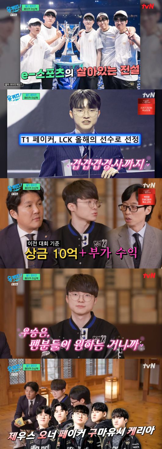20일 전파를 탄 tvN ‘유 퀴즈 온 더 블럭’에 페이커가 게스트로 나왔다. 2020년에 이어 3년 만에 다시 나온 그는 제19회 항저우 아시안게임 금메달, 2023년 롤드컵 우승 타이틀을 달고 금의환향했다. 올해의 선수로도 꼽힌 페이커는 “좋은 경험했다는 거에 감사하고 만족하고 있다”며 겸손한 소감을 밝혔다.