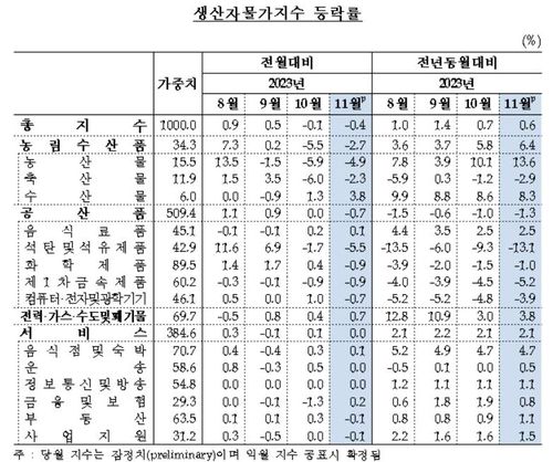 전력·가스·수도 및 폐기물은 전월 대비 0.7% 상승했다. 11월 중 산업용 전기 요금 인상으로 산업용 전력 가격이 4.6% 오른 영향이다.