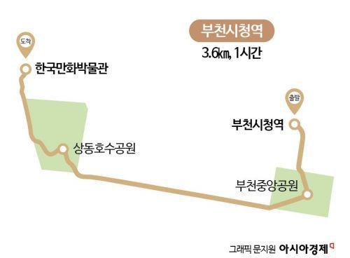 오늘 코스의 출발점은 서울 지하철 7호선 부천시청역이다. 이름에서 알 수 있듯이 경기 부천시의 중심인 부천시청이 인근에 있고, 부천 인구 중 30%가량이 사는 중동 신도시의 중심 지역이다. 시청사 역시 신도시 개발이 한창이던 1990년대 후반에 함께 지어졌다. 인근의 백화점과 영화관 등이 있는 번화가가 밀접해 있어 많은 부천시민이 찾는 역이다.