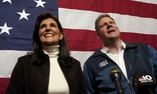 미국 공화당 대선 후보로 나선 니키 헤일리 전 주유엔 미국대사(왼쪽)가 지난 12일(현지시각) 뉴햄프셔주 맨체스터에서 자신을 지지한다고 선언한 크리스 수누누 뉴햄프셔 주지사와 함께 기자들의 질문에 답하고 있다. 맨체스터/AP 연합뉴스 |