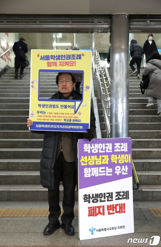 (서울=뉴스1) = 조희연 서울시교육감이 21일 오전 서울 도봉구 창동역 앞에서 '학생인권 조례 선생님과 학생이 함께드는 우산' 피켓을 들고 학생인권조례 폐지에 반대하는 1인 시위를 하고 있다. (서울시교육청 제공) 2023.12.21/뉴스1photo@news1.krCopyright ⓒ 뉴스1. All rights reserved. 무단 전재 및 재배포, AI학습 이용 금지.