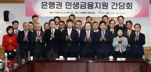 김주현 금융위원장(앞줄 오른쪽 세 번째부터), 조용병 은행연합회장, 이복현 금융감독원장이 21일 서울 중구 은행연합회관에서 열린 은행권 민생금융지원 간담회에서 참석한 은행장들과 기념촬영을 하고 있다. 2023.12.21/뉴스1 / |