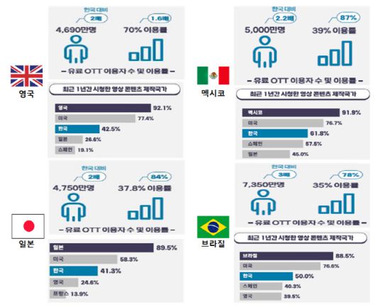 ‘최근 1년간 시청한 영상 콘텐츠 제작국가’ 조사에서 영국의 경우 △영국(92.1%) △미국(77.4%) △한국(42.5%) △일본(26.6%) △스페인(19.1%), 일본의 경우 △일본(89.5%) △미국(58.3%) △한국(41.3%) △영국(24.6%) △프랑스(13.9%) 순이었다.