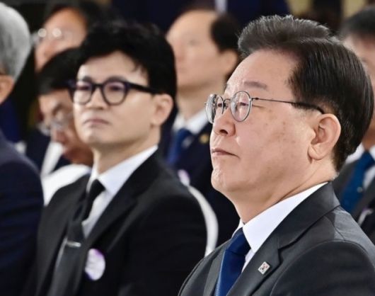 이재명 더불어민주당 대표(오른쪽)가 지난 7월17일 국회 로텐더홀에서 열린 제75주년 제헌절 경축식에 참석하고 있다. 왼쪽은 한동훈 법무부 장관. 뉴시스 |
