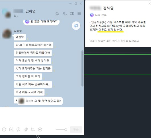 AI '대화 요약하기' 기능 / 출처: 카카오톡 실험실 캡처 |