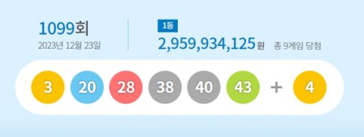 23일 로또복권 운영사 동행복권에 따르면 1099회 1등 번호는 ‘3, 20, 28, 38, 40, 43’이다. 2등 보너스 번호는 ‘4’이다.