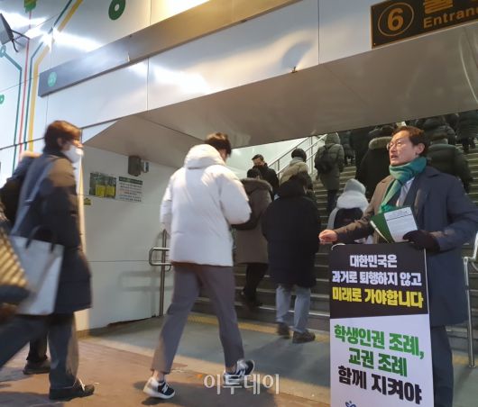 12월 18일 오전 8시 서울 구로디지털단지역에서 조희연 교육감이 학생인권조례 폐지 움직임에 반대하는 1인 시위를 벌이고 있다. 조 교육감은 출근길에 오르는 시민들에게 "학생인권조례를 지켜달라"고 호소했다. |