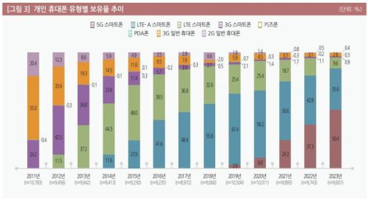 개인 휴대폰 유형별 보유율 추이. 정보통신정책연구원(KISDI) 2023년 한국미디어패널조사 |