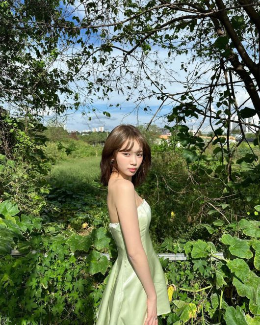 해당 사진 속 김채원은 '쌈무' 별명을 떠오르게 하는 싱그러운 초록색 원피스를 입고 주변 숲과 어우러져 매력을 발산했다.