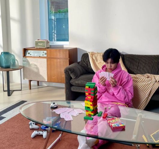 공개된 사진 속 임영웅은 핑크색 트레이닝복을 입고 훈훈한 비주얼을 뽐내는 모습. 카드에 집중하고 있는 그의 모습이 시선을 모은다.