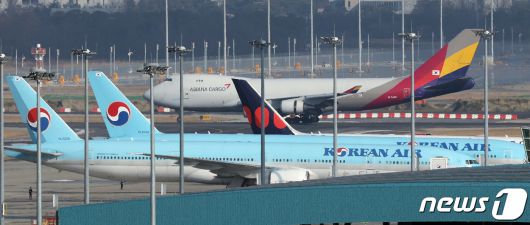(인천공항=뉴스1) 박정호 기자 = 대한항공과 아시아나항공의 합병이 해를 넘기게 된 가운데 26일 오후 인천국제공항 계류장에 대한항공과 아시아나항공의 항공기가 지나고 있다. 최근 유럽연합(EU) 경쟁당국은 2024년 2월14일 전까지 대한항공과 아시아나항공의 기업결합 심사를 잠정적으로 결론 내리겠다고 공지했다. 2023.12.26/뉴스1