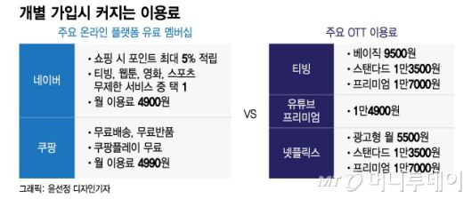 네이버가 유료멤버십 혜택으로 제공하는 티빙 베이직의 월 이용료는 개별 가입시 9500원이다. 넷플릭스(1만3500원)나 유튜브프리미엄(1만4900원) 등 다른 OTT 서비스 가입비용과 비교하면 30~50% 수준의 가격으로 다른 혜택과 함께 OTT 서비스를 제공하는 셈이다.