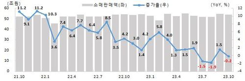 지난 10월 소매판매액은 53조9천억원으로 0.2% 줄었다. 고금리, 고물가에 따른 소비 여력 약화로 승용차(-4.3%), 가전제품(-7.5%) 등 내구재와 화장품(-12.4%) 등 비내구재 소비가 줄었다.