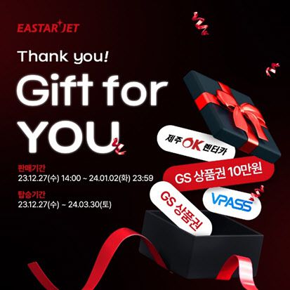 이와 함께 이스타항공은 구매 고객 중 추첨을 통해 △GS상품권 10만원권(3인) △GS상품권 5만원권 (4인) △OK렌터카 24시간이용권(10인) △VPASS 제주올패스권(10인)을 지급한다.