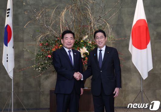 (서울=뉴스1) 황기선 기자 = 일본을 공식 방문한 김진표 국회의장이 27일 일본 도쿄 총리관저에서 기시다 후미오 일본 내각총리대신과 면담 전 악수를 나누고 있다. (국회 제공) 2023.12.27/뉴스1juanito@news1.krCopyright ⓒ 뉴스1. All rights reserved. 무단 전재 및 재배포, AI학습 이용 금지.