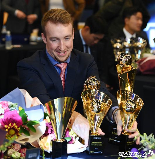 연말 시상식에서도 페디의 이름이 자주 호명됐다. 그는 평균자책점과 승리, 탈삼진 부문까지 투수 '3관왕'을 차지한 데 이어 올해 신설된 수비상에서도 투수 부문 수상자가 됐다. KBO 시상식에서는 111표 중에서 무려 102표(91.9%)를 얻으며 6표를 받은 노시환(한화)을 제치고 MVP(최우수선수)로 선정됐다.