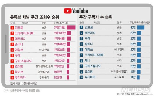 [서울=뉴시스] 안호균 기자 = 숏폼 크리에이터 김프로(KIMPRO)가 12월 마지막주 국내 유튜브 채널 구독자수와 조회수 1위를 차지했다.