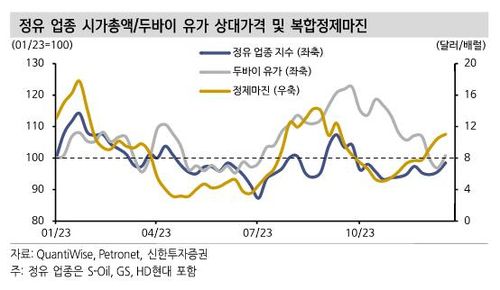 또한 "유가 하락에도 오히려 정제마진은 11월 이후 재차 반등하며 정유 업황은 여전히 견고하다는 것을 증명했다"며 "정제마진 상승은 겨울철 난방유 성수기, 낮은 석유제품 재고, 중국 수출 감소 등에 기인하며 단기적으로 상방 압력은 확대될 것"으로 전망했다.