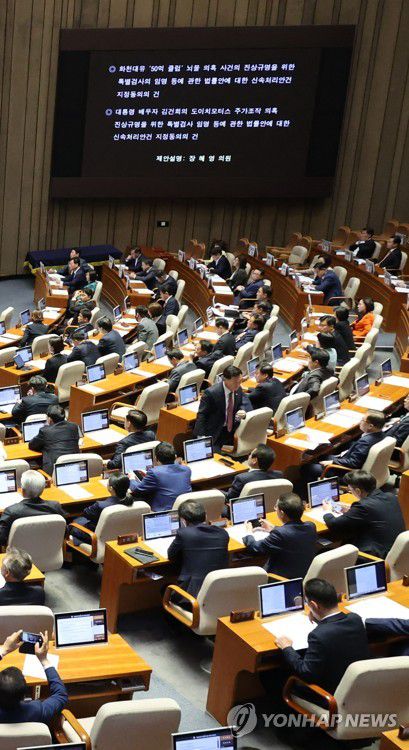 더불어민주당은 윤석열 대통령 부인 김건희 여사의 도이치모터스 주가 조작 의혹 특별검사 도입 관련법과 대장동 50억 클럽 의혹 특검법을 묶어 '쌍특검법'으로 칭하고 이날 본회의에서 강행 처리할 방침이다.