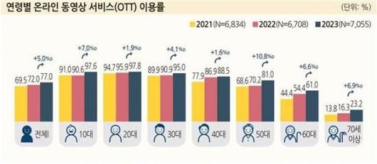 28일 방송통신위원회가 전국 4633가구에 거주하는 만 13세 이상 남녀 7055명을 대상으로 실시한 '2023 방송매체 이용행태조사' 결과에 따르면 올해 OTT 이용률은 77.0%로 지난해보다 5.0%포인트 늘었다. 연령별로는 20대(97.8%)와 10대(97.6%)의 이용률이 가장 높았다. 50대도 81.0%로 전년 대비 10.8%포인트 증가했다. 60대(61.0%)와 70세 이상(23.2%)도 전년 대비 각각 6.6%포인트 6.9%포인트 상승했다.